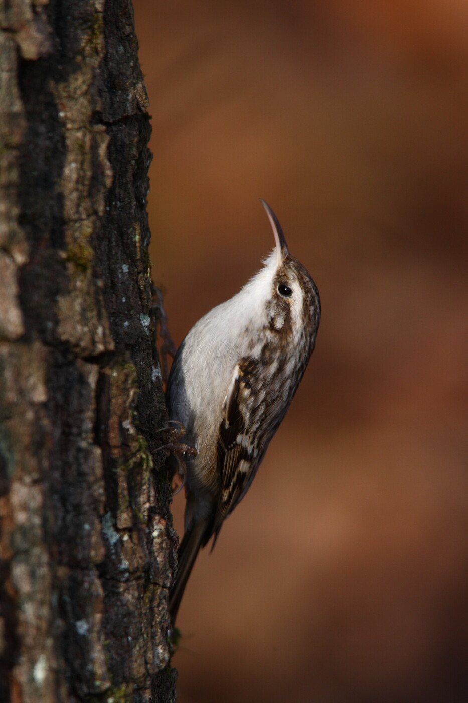 Der winzig kleine Gartenbaumläufer ist gut getarnt. Oft entdecken wir ihn erst, wenn er vom Baumstamm, an dem er gerade noch senkrecht herumturnte, auffliegt. Am besten ist er von seinem Verwandten, dem Waldbaumläufer, an der Stimme zu unterscheiden. Der kleine Baumläufer hat sich mit seinen langen Krallen und dem spitzen Schnabel an das Leben in der Senkrechten angepasst. In der Rinde sucht er entlang des Baumstamms nach Nahrung.