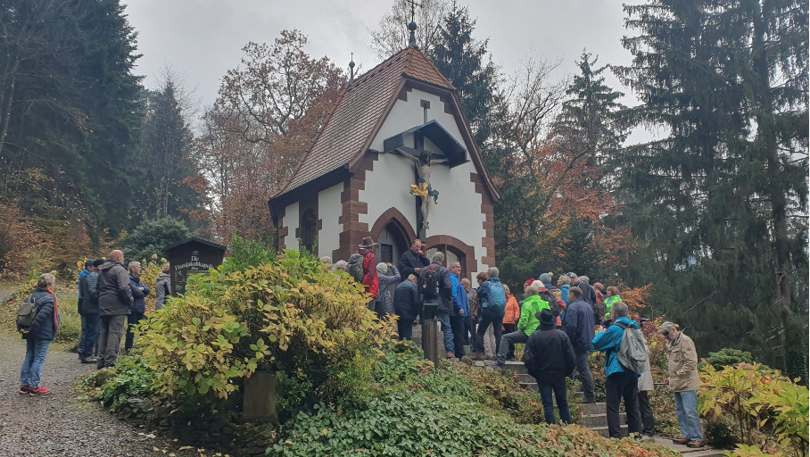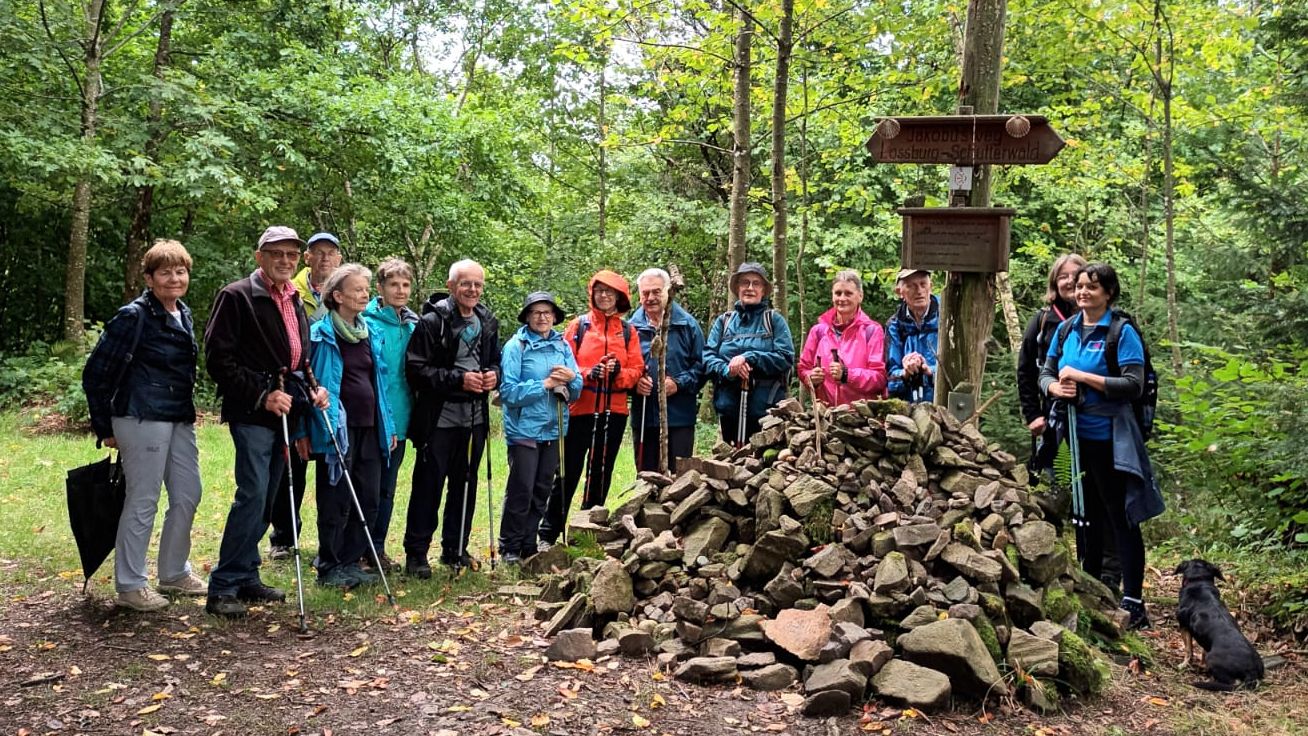 Am Donnerstag, den 11.09.2025 nahmen 16 Wanderer und ein Vierbeiner an der Nachmittagstour in heimischen Gefilden teil. Pünktlich zur Startzeit konnte die Gruppe trockenen Fußes vom Ausgangspunkt an der Erzpoche auf schmalem, steilem Pfad über den Pfarrberg hinauf zum „Cruz de Ferro“ starten. Weiter ging es auf dem Teilstück des Kinzigtäler Jakobusweges mit herrlichem Blick auf das Sulzbachtal und kurzer Rast bei der Pilgerklause. Auf dem Hausacher Bergsteig erreichte die Wandergruppe den Aussichtspunkt Uhlseppenhofhöhebei sonnigem Wetter. Von dort ging es hinab in den Hauserbach, wo die Teilnehmer alle sehr herzlich und mit Kaffee und leckerem Kuchen erwartet wurden. Frisch gestärkt trat die Wandergruppe schließlich den Rückweg von der Kapelle im Hauserbach zum Ausgangspunkt an. Die Wanderstrecke betrug ca. 8,5 km mit 430 Höhenmetern Anstieg und 410 Höhenmetern Abstieg.
