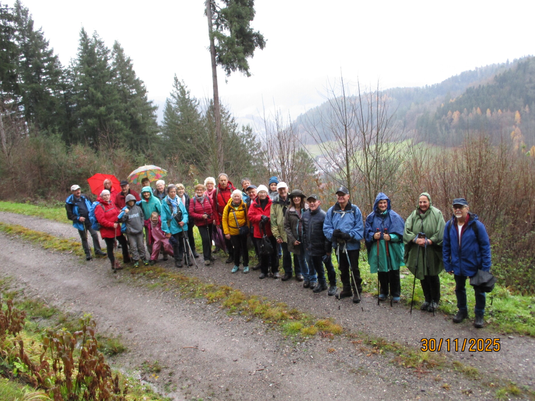 Am 1. Adventssonntag lud der Hausacher Schwarzwaldverein zu seiner Adventswanderung mit Überraschungsziel ein. 29 Wanderer trotzten dem Regenwetter und ließen sich auf die Überraschung ein. Vom Treffpunkt Friedhofs-Parkplatz führte der Weg am Dorfbauer vorbei Richtung Sägewerk. Über dem Pfarrberg ging es nochmals bergauf und nun hinab, an der Limbacher Mühle vorbei, Ins Hauserbachtal. Als über den Erzpocheweg fast die Erzpoche erreicht war, glaubten sich viele schon am Ziel. Jedoch ging es noch ein Stück dem Bach entlang bis zum Stulzlehof, wo die Wanderschar schon von Frank und Hildegard begrüßt wurden. Sie hatten wieder leckeren Glühwein vorbereitet, dazu passten die von ein paar Frauen gebackene Kuchen. In der warmen Stube saßen alle noch gemütlich zusammen. Der Dank galt Hildegard und Frank für den wohlschmeckenden Glühwein, sowie dem Wanderführer Otto und der Organisatorin Anneliese und auch Cezel für die Verfügungstellung des Gastraumes.